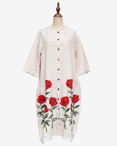 Round Neck Loose Linen Long Dress embroidered with 8 roses in Linen Fabric